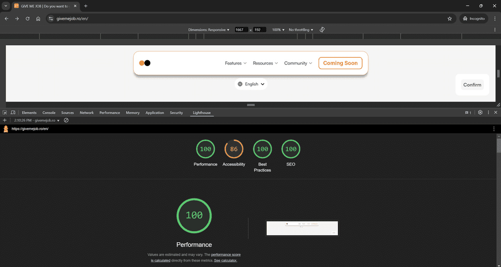The initial lighthouse results were 100 for performance, 86 for accessibility, 100 for best practices, and 100 for SEO.