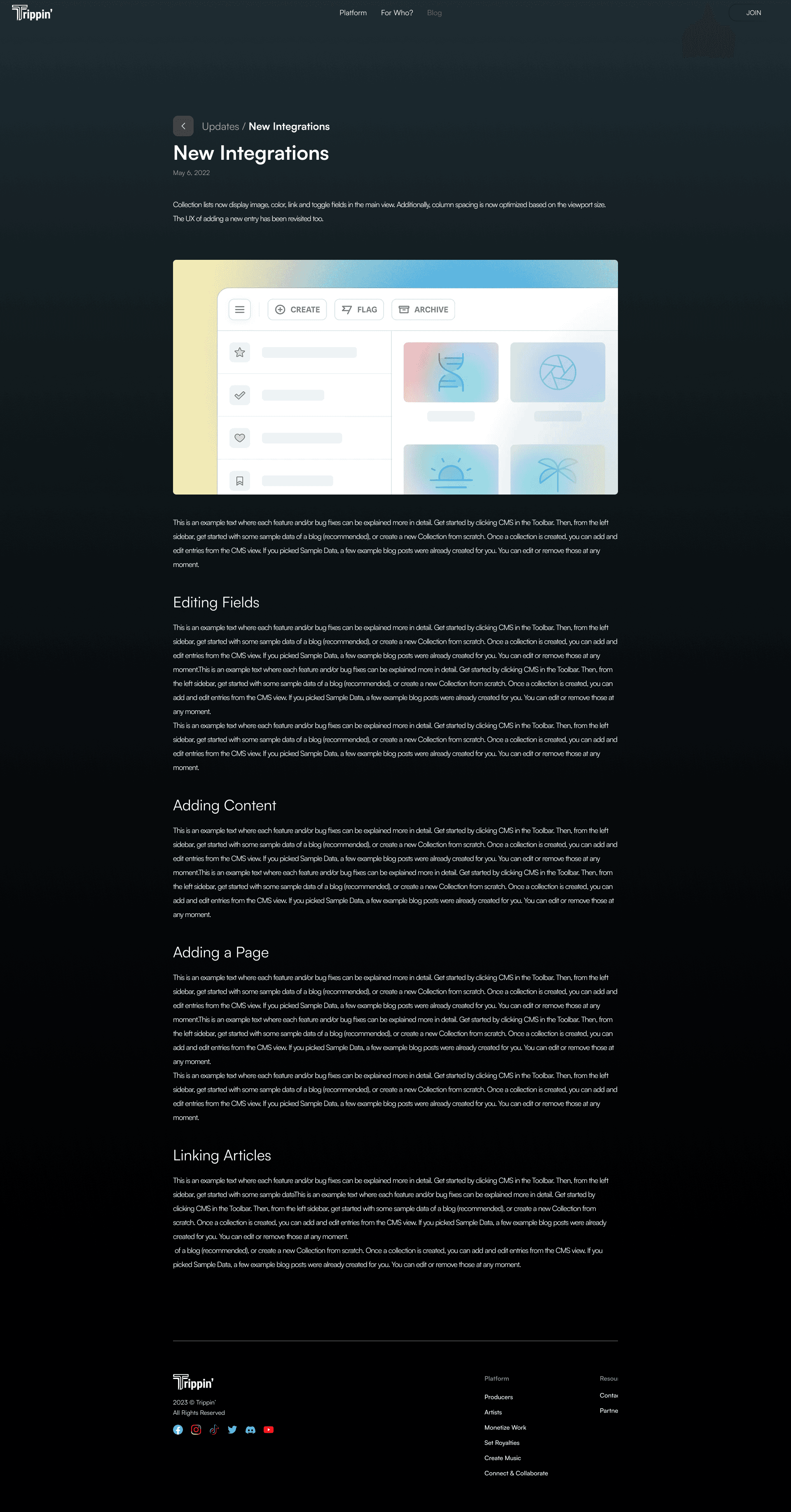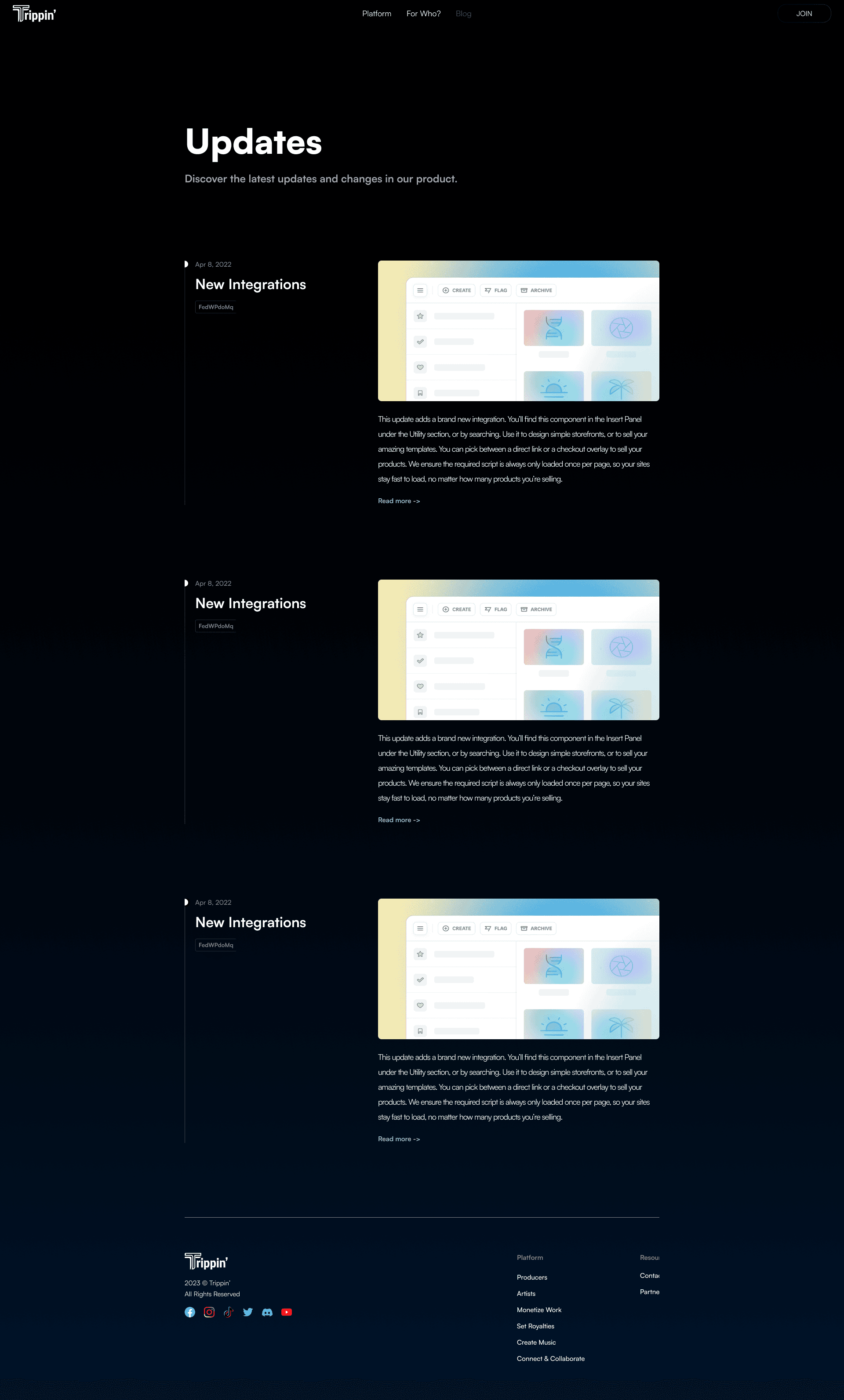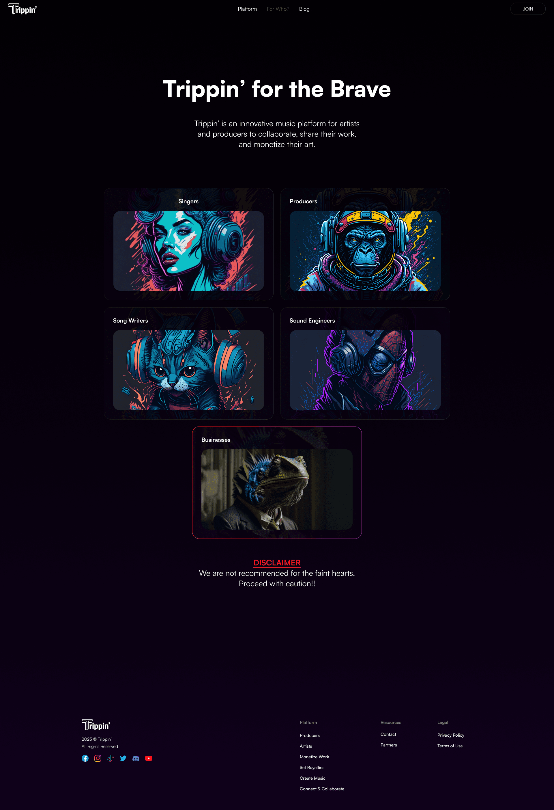 Trippin' Audio's website establishes the platform's legitimacy and innovation in the music industry by providing comprehensive information on how it assists independent artists in distributing, promoting, and monetizing their music. The site encourages engagement within the Trippin' Audio ecosystem by prompting artists, producers, and fans to register. It also showcases the business model, unique value proposition, and growth potential to attract investors and strategic partners. Additionally, the website is optimized for search engines, ensuring that artists seeking improved music distribution solutions can discover Trippin' Audio organically.